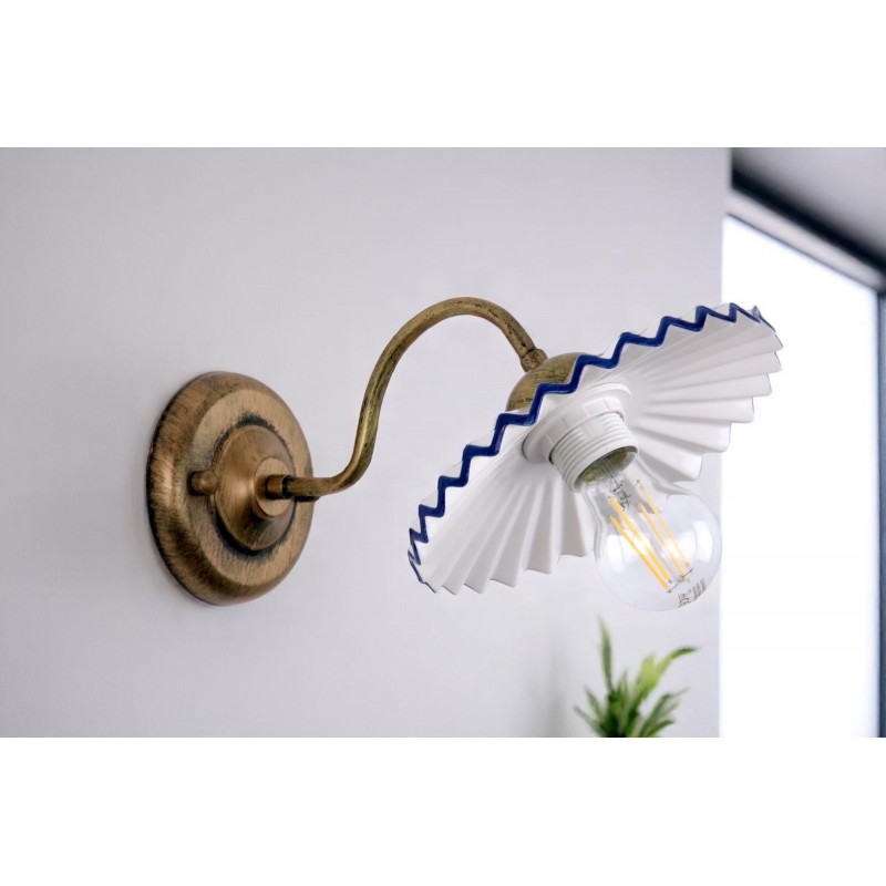 Porta un tocco di eleganza rustica vintage nella tua casa con l'applique da parete ELENA-A di Diamantlux. Questa affascinante lampada combina il calore della ceramica bianca rifinita con un delicato bordo decorato blu, contrastando con la maestosità del metallo nero/oro curvato in avanti. L'unione di questi materiali e finiture crea un pezzo d'arte e funzionalità. Il portalampada E27 (max 60W) offre la flessibilità di utilizzare una varietà di lampadine, consentendo di creare l'atmosfera perfetta per il tuo spazio. Lasciati incantare dalla luce soffusa e accogliente che questa lampada emana, aggiungendo un tocco di charme vintage a qualsiasi stanza.