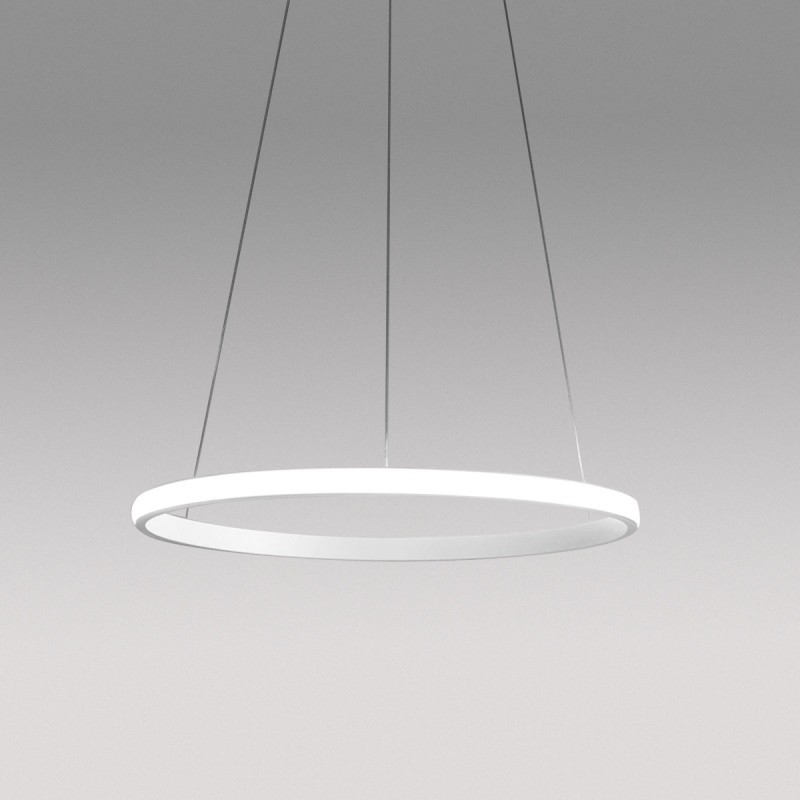 Lampadario a sospensione dal design moderno ed essenziale, caratterizzato da una forma ad anello di Ø60 cm che diffonde una luce morbida e uniforme a 360°.