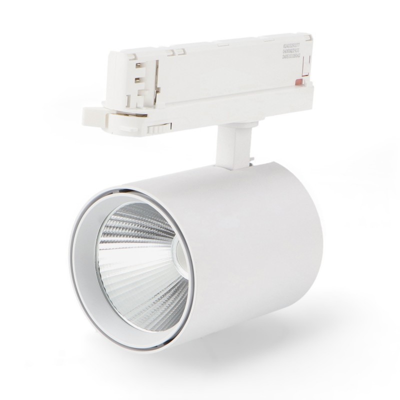 Faretto LED 30W per binario trifase disponibile in bianco o nero, con luce regolabile 3CCT e tecnologia No Flicker. Ideale per negozi e ambienti professionali.