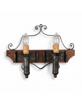 Questa lampada da parete unisce la robustezza del ferro battuto con il calore e l'autenticità del legno, creando un design che richiama le antiche fucine. La struttura supporta due luci (E14) che, con l'uso di lampadine decorative a fiamma o a candela, ricreano una suggestiva atmosfera d'epoca.