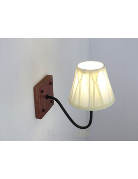 Lampada da parete, braccio in metallo nero, base in legno marrone.