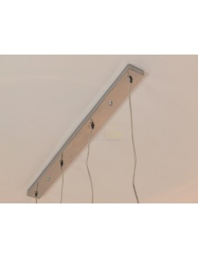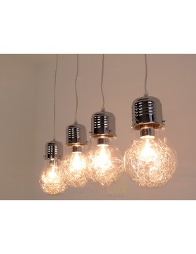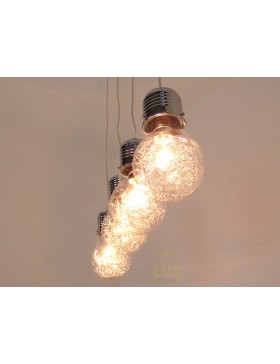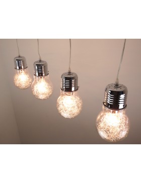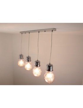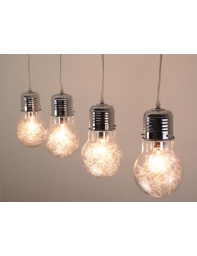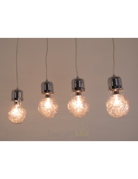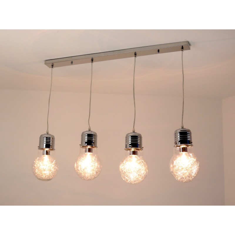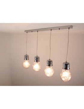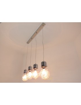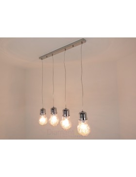 La lampada a sospensione NADIA SB4 di Diamantlux è un pezzo di design unico, caratterizzato da un'elegante asta in metallo cromato lunga 90 cm, dalla quale pendono quattro luci indipendenti. L'elemento distintivo sono i diffusori in vetro soffiato trasparente, abilmente modellati per replicare l'iconica forma di una lampadina gigante. All'interno di ciascun diffusore, un raffinato filo di alluminio crea un effetto decorativo scintillante. Con un'altezza facilmente regolabile fino a 110 cm e 4 attacchi E27 (max 60W), NADIA SB4 è la scelta ideale per illuminare con eleganza salotti, sale da pranzo o banconi moderni, garantendo un'emissione luminosa ampia e personalizzabile.