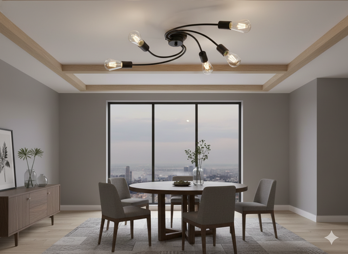 La Plafoniera da soffitto 147 P4 di Diamantlux incarna lo stile ferro battuto moderno, pur essendo realizzata in robusto metallo verniciato. La lampada presenta una struttura con quattro bracci curvi che si estendono dalla base centrale, offrendo una distribuzione luminosa equilibrata come si vede nella foto. La finitura Marrone Rustica (come nella foto allegata) aggiunge un tocco contemporaneo e rustico rivisitato. I quattro attacchi E27 sono un grande vantaggio funzionale, permettendo l'installazione di lampadine LED di alta potenza per un'illuminazione brillante e funzionale, ideale per coprire ampi spazi come cucine o soggiorni. Con misure di e una profondità di , offre un ingombro moderato ma un'ottima resa estetica e luminosa.