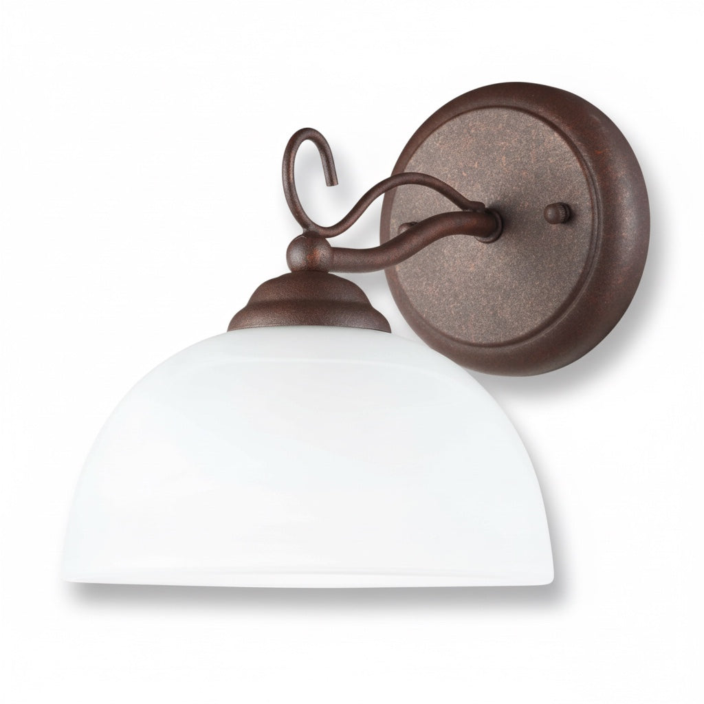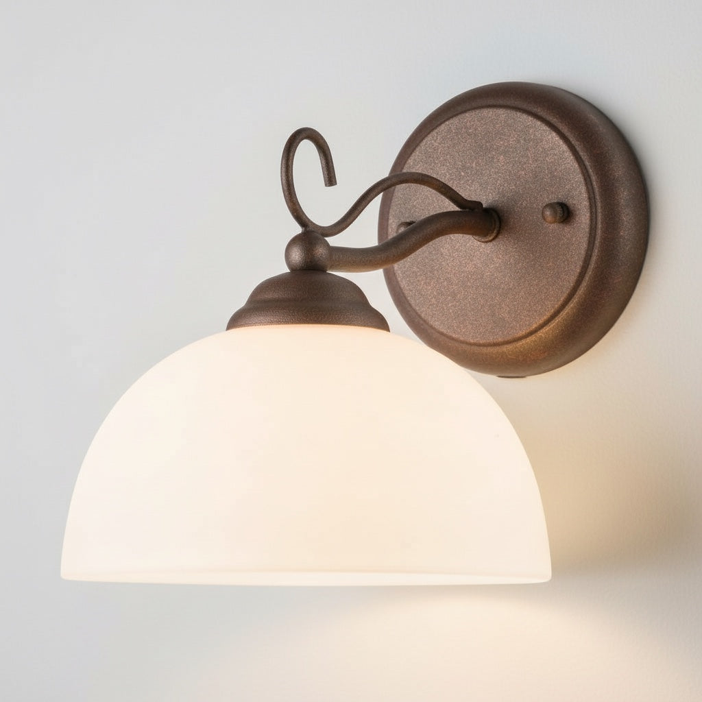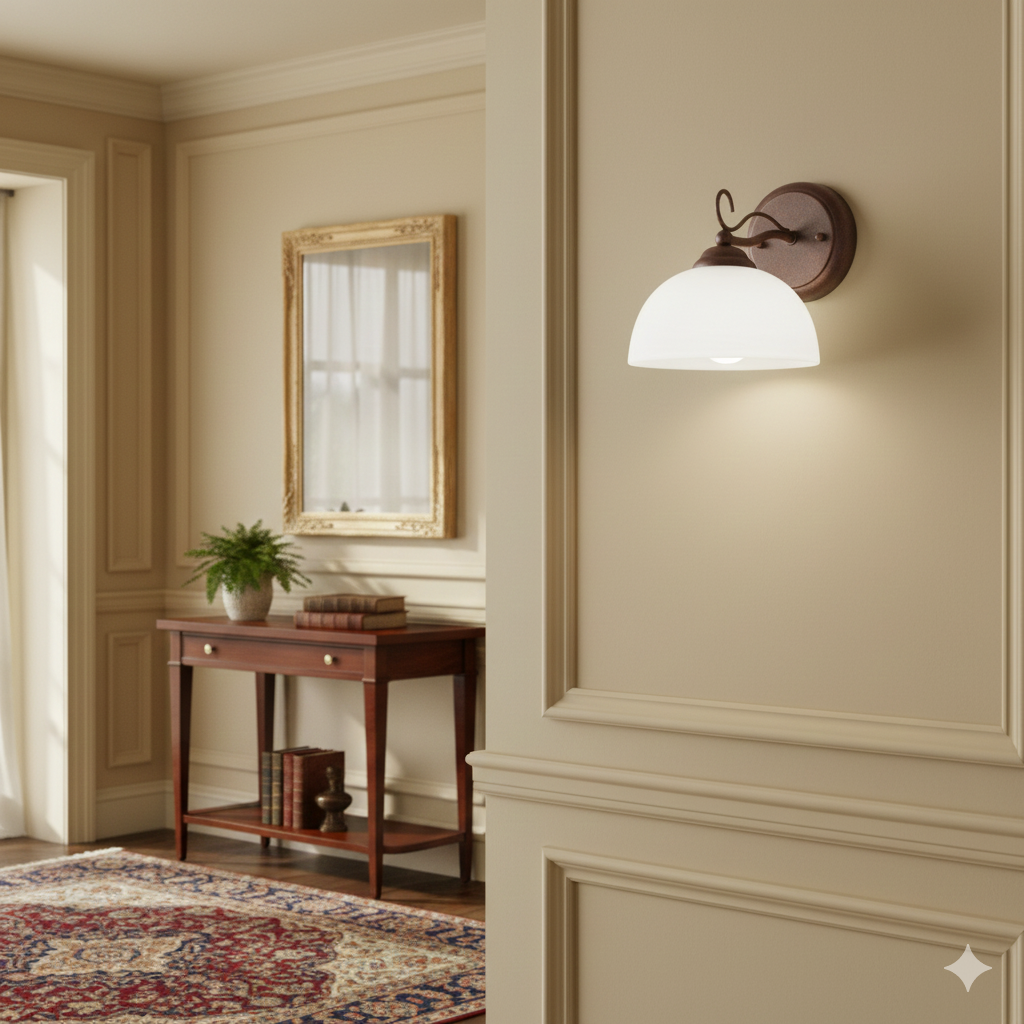 Applique da parete classica in metallo verniciato marrone con diffusore in vetro alabastro satinato dalle delicate striature bianche. La forma a mezza sfera distribuisce la luce uniformemente in molteplici direzioni, adattandosi perfettamente sia agli ambienti classici contemporanei che agli spazi rustici. Dotata di portalampada E27, consente l'utilizzo di lampadine di qualsiasi classe energetica, fino alla A++. Design sobrio e versatile, ideale per chi ricerca eleganza senza compromessi.