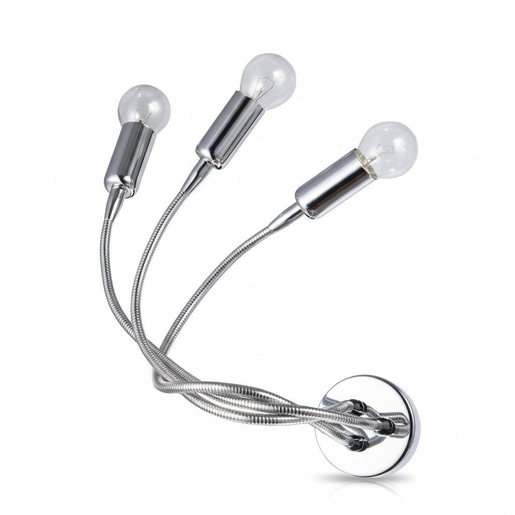 I tre bracci flessibili orientabili permettono di direzionare la luce in modo indipendente, garantendo massima versatilità in base alla funzione o all’atmosfera desiderata. Questa configurazione la rende ideale per installazioni sopra specchi larghi, pareti da valorizzare o punti lettura multipli.