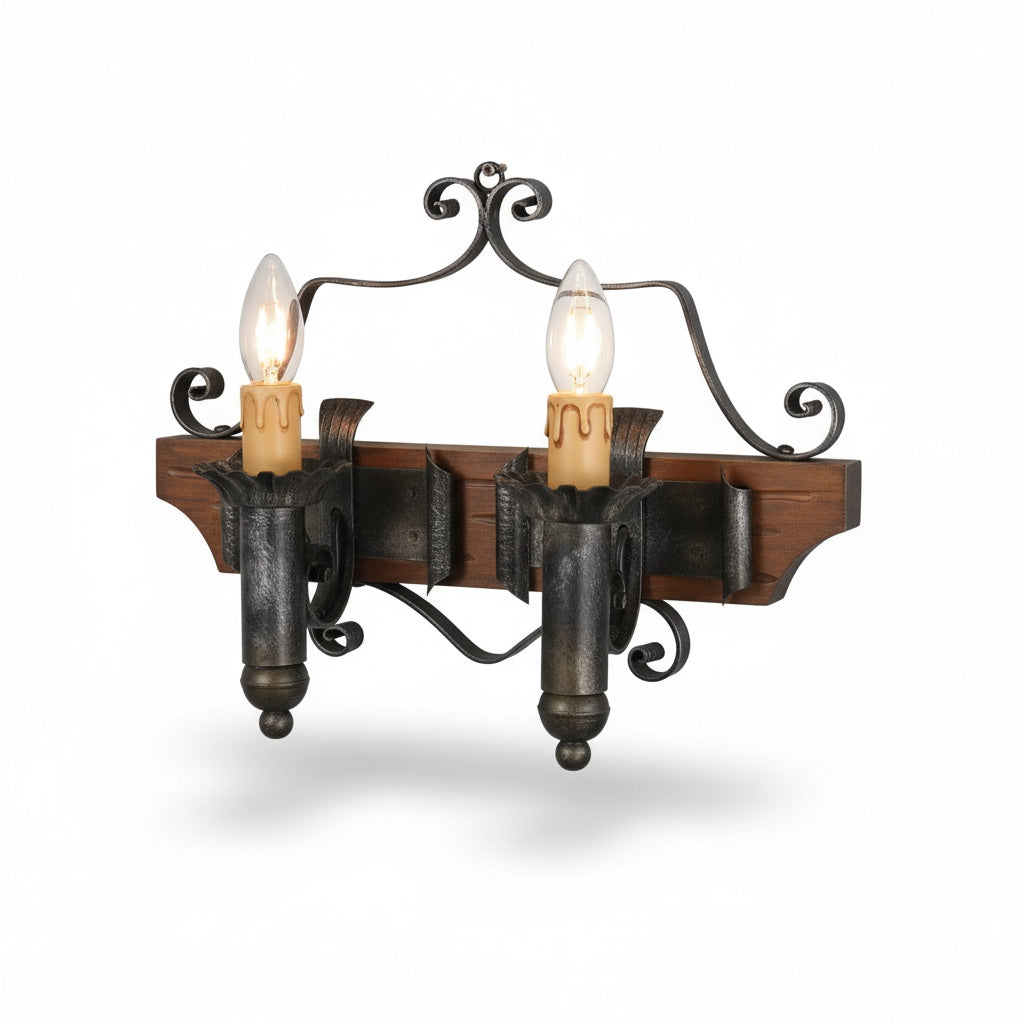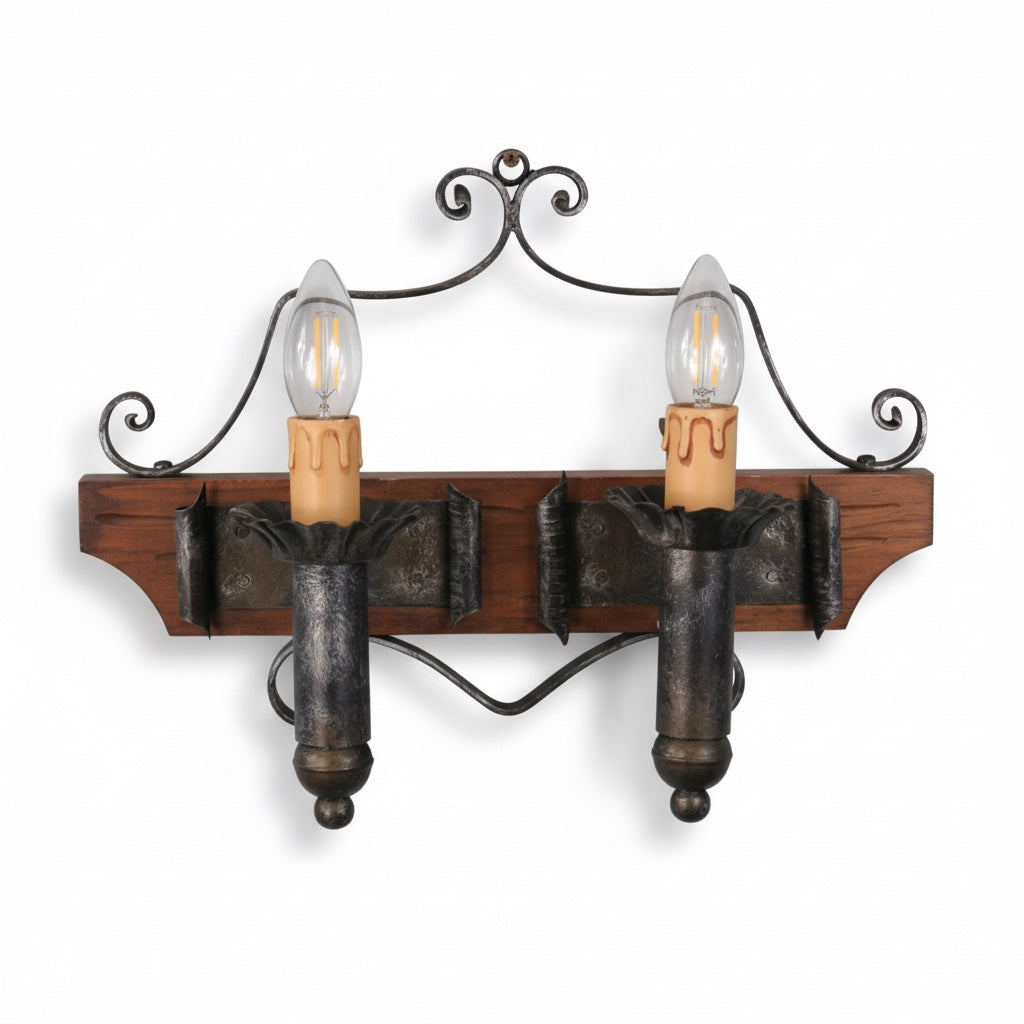 Questa lampada da parete unisce la robustezza del ferro battuto con il calore e l'autenticità del legno, creando un design che richiama le antiche fucine. La struttura supporta due luci (E14) che, con l'uso di lampadine decorative a fiamma o a candela, ricreano una suggestiva atmosfera d'epoca.