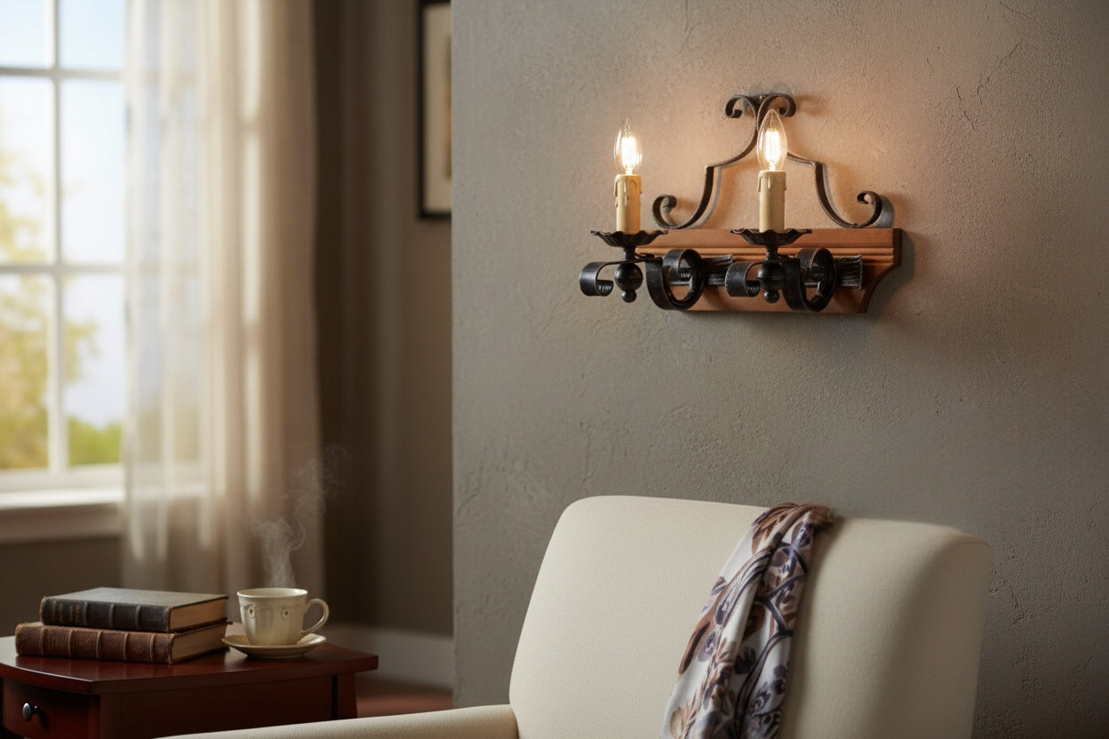 Questa Applique in ferro battuto per interni modello 902-A2 è l'espressione autentica dell'artigianato Made in Italy. Ogni pezzo unisce la maestria della lavorazione del ferro battuto alla consistenza robusta del legno scuro, un abbinamento che conferisce un carattere storico e rustico inconfondibile.