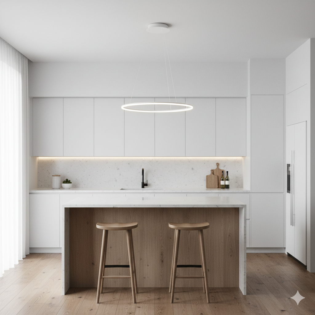 Il lampadario Serie Halo interpreta l'illuminazione circolare con un design essenziale e raffinato. La struttura è composta da un unico anello in alluminio satinato bianco dal diametro di 80 cm, sostenuto da cavi ultra-sottili regolabili che permettono una sospensione massima fino a 3 metri. Questa flessibilità lo rende la soluzione ideale per arredare con eleganza sia soffitti di altezza standard che ambienti dai volumi importanti, loft o vani scala.