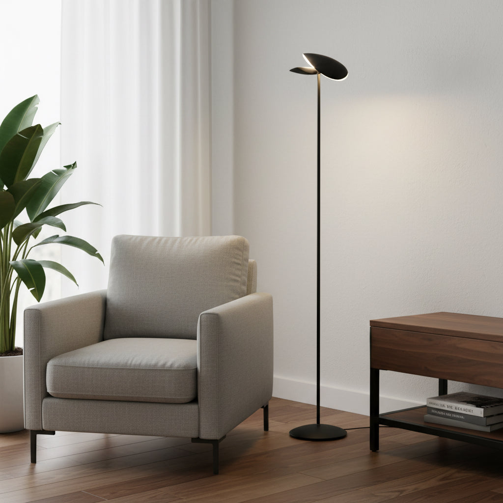 La piantana LED Gea Luce, disponibile nelle varianti GPIN01 (nero opaco) e GPIB01 (bianco opaco), è progettata per offrire la massima personalizzazione della luce. La sua caratteristica principale è la testa snodabile che permette una rotazione fino a 270°, garantendo la possibilità di direzionare il flusso luminoso con estrema precisione. Grazie alla rotazione indipendente delle due parabole, è possibile orientare la luce in due direzioni diverse contemporaneamente, rendendola perfetta sia per l'illuminazione d'ambiente che per la lettura.