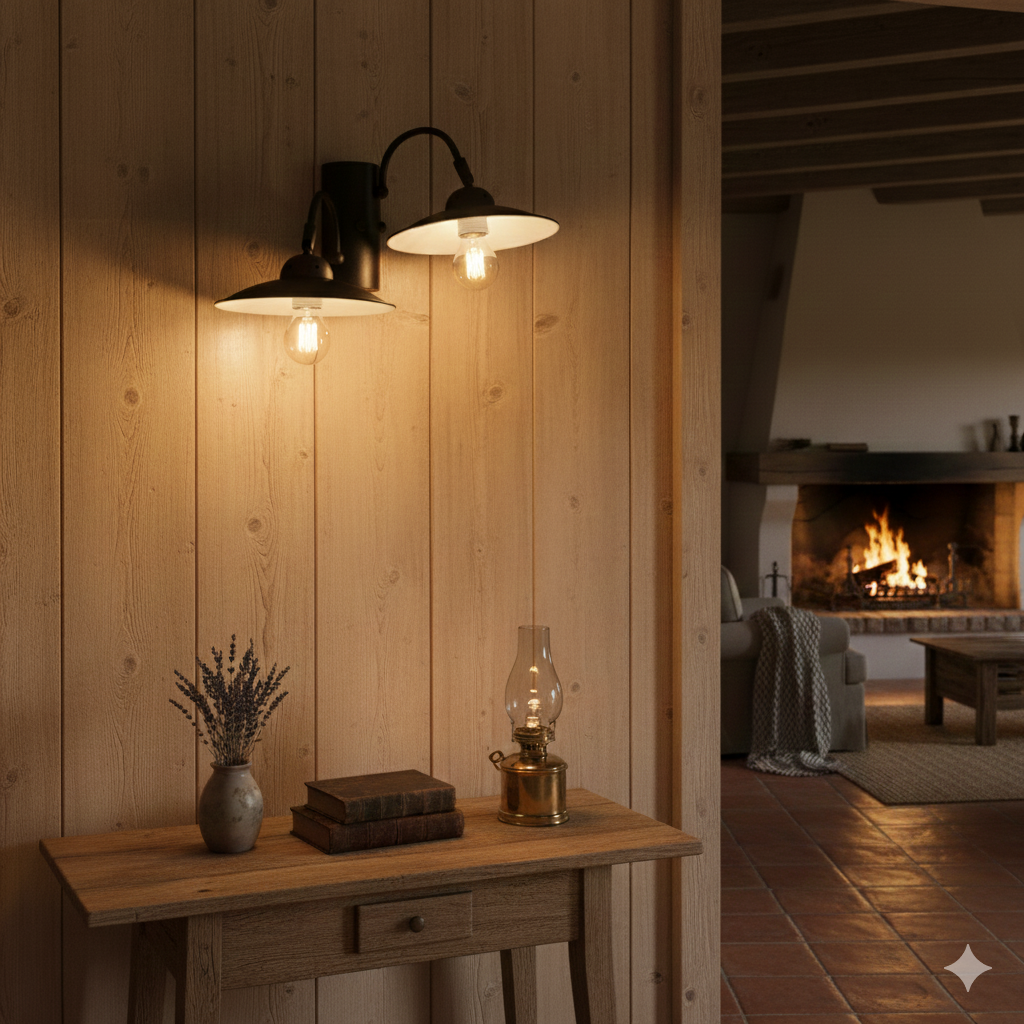 Questa applique si integra con arredi in legno, pietra o ferro battuto, valorizzando ambienti country, vintage o classici, e crea un piacevole contrasto anche in contesti moderni con finiture chiare, mantenendo un’atmosfera calda e raffinata.