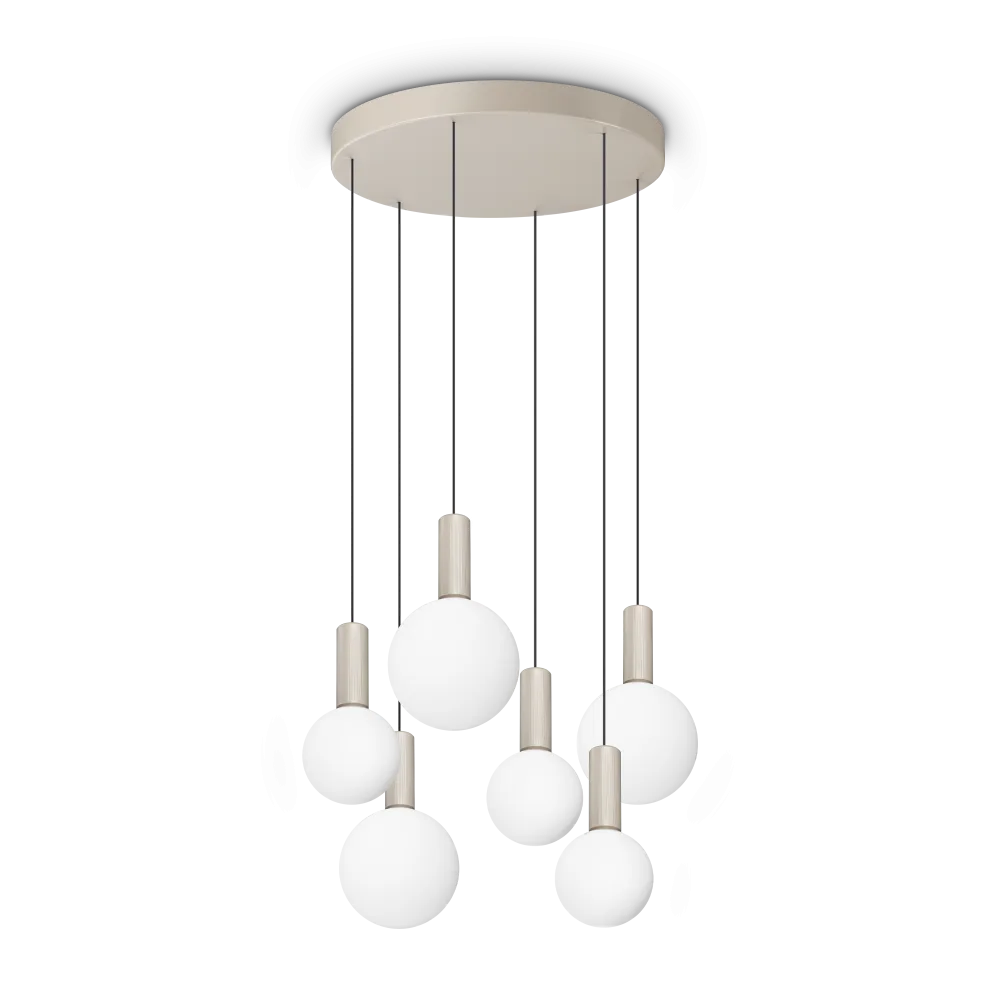Il lampadario a sospensione Odeon SP6 Round di Ideal Lux è una sintesi perfetta tra minimalismo geometrico e tecnologia luminosa avanzata. Caratterizzato da una base tonda magnetica da 42 cm, questo lampadario sostiene 6 eleganti diffusori a sfera in vetro soffiato bianco acidato, sorretti da una montatura cilindrica con un raffinato decoro rigato. Grazie alla potenza del LED integrato e ai suoi 5500 lumen, offre un'illuminazione diffusa, potente e uniforme, ideale per valorizzare un salone moderno, un'ampia zona pranzo o per creare un effetto scenografico in ambienti con soffitti alti. I cavi regolabili fino a 250 cm permettono di personalizzare l'altezza e la disposizione delle sfere, adattandole perfettamente allo spazio. Odeon SP6 non è solo un corpo illuminante, ma un elemento d'arredo di design che unisce la purezza del vetro soffiato alla praticità del montaggio magnetico, garantendo un'estetica pulita e senza viti a vista.